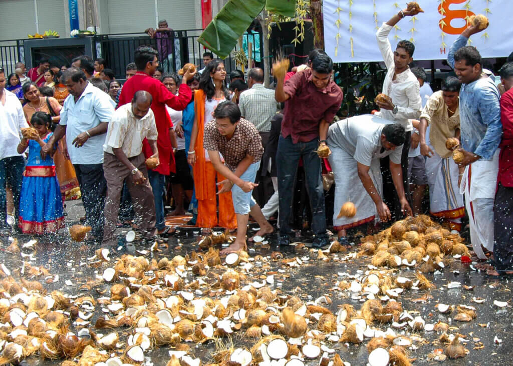 Also, a distinctive feature of Thaipusam is the ritual smashing of coconuts. Devotees break coconuts as an offering to Lord Murugan, symbolising the breaking of the ego and the removal of obstacles. Broken coconut shells litter the streets along procession routes.
