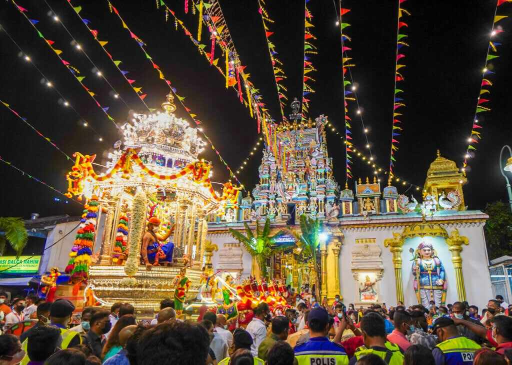In Penang, Thaipusam is known for its dramatic kavadi rituals, vibrant crowds and all-night ceremonies. The most famous event is the procession of two chariots (one silver, one gold) from Sri Mahamariamman Temple on Queen Street in George Town, all the way to Waterfall Temple.