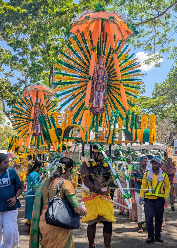 - Devotees carrying kavadi (elaborate metal frames attached with hooks and piercings)